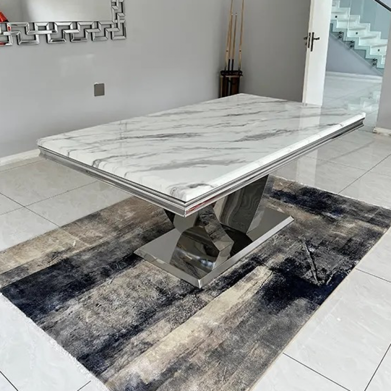 Stylish grandeur providing an instant focal point to your room, the marble top dining table is perfect for those who aspire to a stylish dining experience. Comprising of a beautiful marble top which is complemented with a striking polished stainless steel base. The marble tops is incredibly hardwearing and scratch resistant. It’s pedestal base is solid and heavy weighing making it extremely sturdy. The sleek lines and smooth materials make it easy to wipe, clean and the perfect balance of style and functionality. It works really well with 6 chairs. Dimensions: -180cm x 100cm x 75cm Material: -Marble -Stainless Steel
