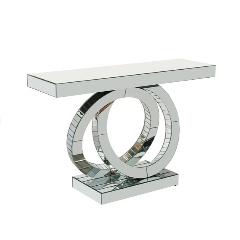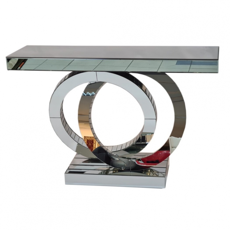 Sparkly silver mirrored diamond console table. Bevelled panel mirrors to all sides. Inlaid panels containing tiny dazzling crushed sparkly crystals. An eye catching spectacle in any setting.