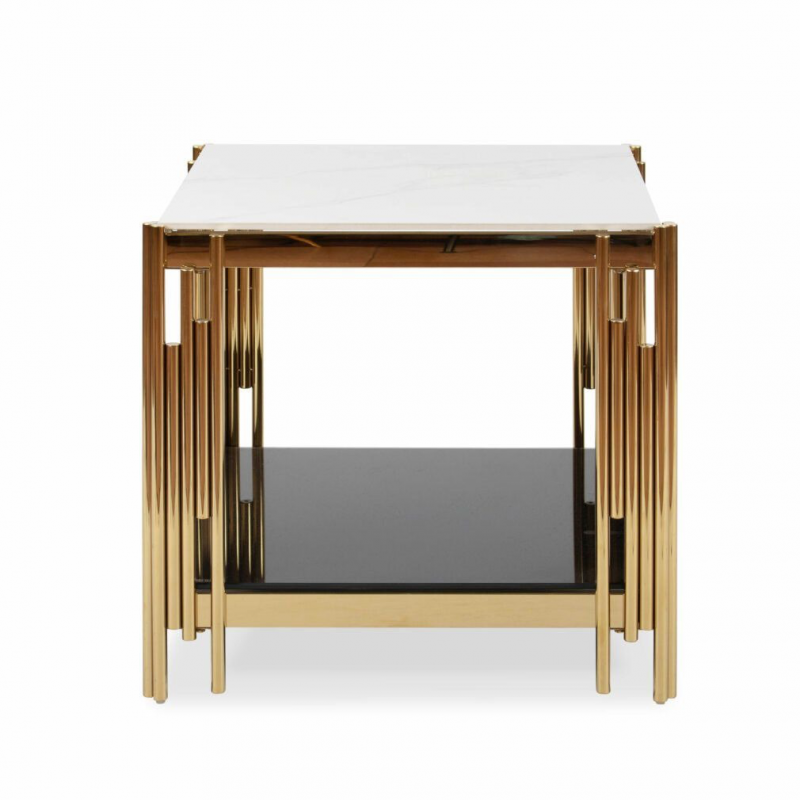 The Bali Side Table offers a compact yet versatile size that fits perfectly in any living space. Measuring 55 centimeters in length, and 55 centimeters in width, and standing at a height of 55 centimeters, the Bali Side Table offers a compact yet versatile size. Its sleek design and clean lines create a modern aesthetic that complements various interior styles. The Bali Side Table boasts a two-tier design, adding style and functionality. The top tier features a decorative faux white marble tabletop, creating a luxurious and timeless look. The dark-tempered glass bottom shelf adds a contemporary touch and provides additional storage or display space.