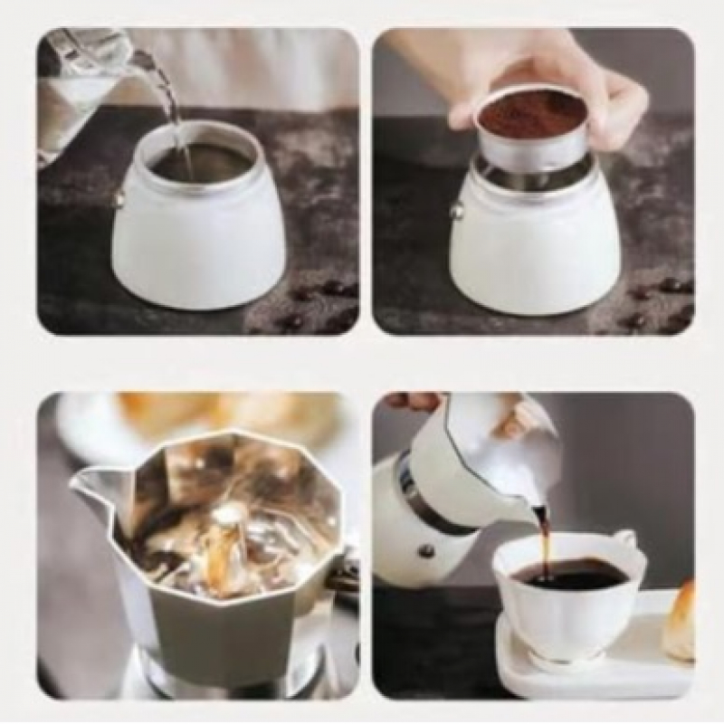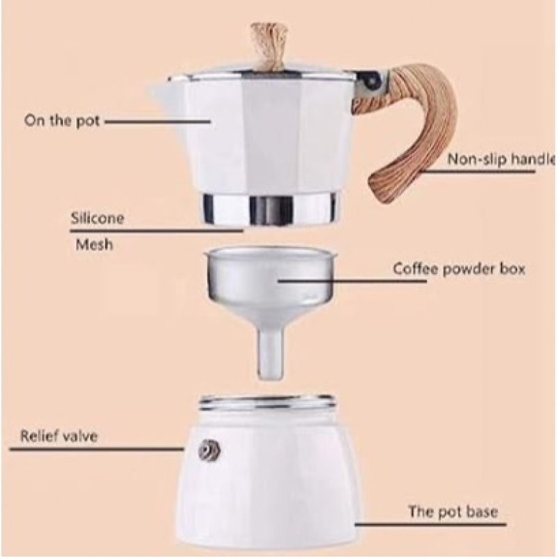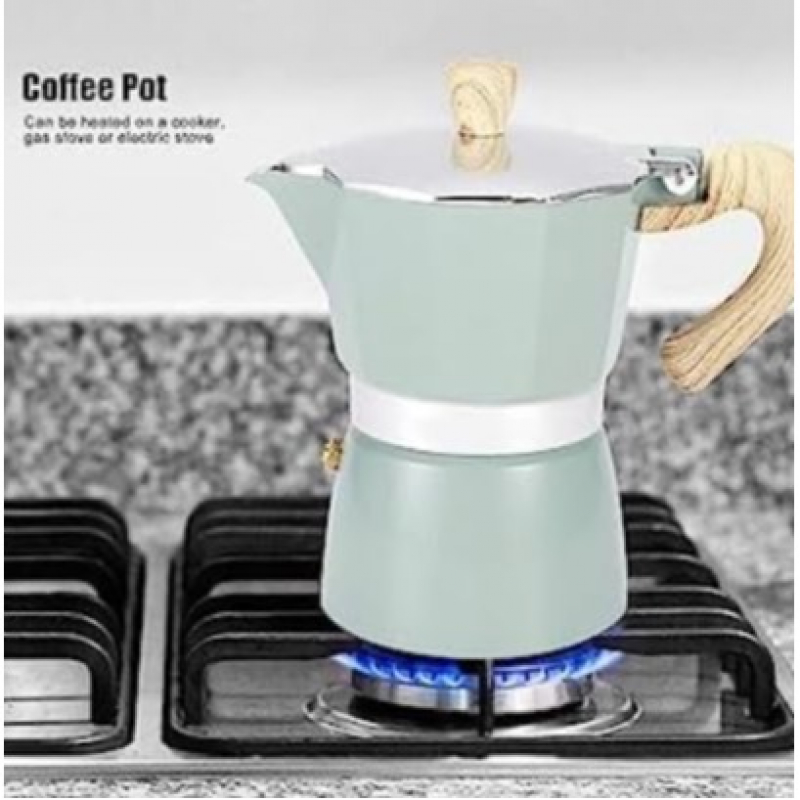 Elevate your coffee brewing experience with our stunning octagonal coffee moka pot. Made from high-quality stainless steel material, this durable and reliable coffee maker is designed to stand the test of time. Its unique octagonal shape, coated with lovely pastel colors, adds a touch of elegance and style to your kitchen. The wooden handle provides a comfortable grip and adds a rustic charm to the overall aesthetic. With its sturdy construction and sleek design, our octagonal coffee moka pot is not only a functional brewing tool but also a beautiful addition to your home decor. Indulge in rich, aromatic coffee brewed to perfection with this exquisite moka pot and enjoy a truly elevated coffee experience like never before. Features: - Suitable for Electric, Gas, or Ceramic Cooktops and Fireside as a Camp Coffee Maker - Espresso Coffee Maker Features Premium Pressure Release Valve - Made from Food Safe Aluminum - Capacity/Volume: 3 cup - Rich cafe-style espresso every time Easy to use - Just add water & ground coffee, heat, and serve within 5 minutes. Specifications: - Material: Ceramic - Volume 150ml What's in the box 1 x Moka Stovetop Coffee Pot - 3 Cup - 150ml by Soul Lifestyle