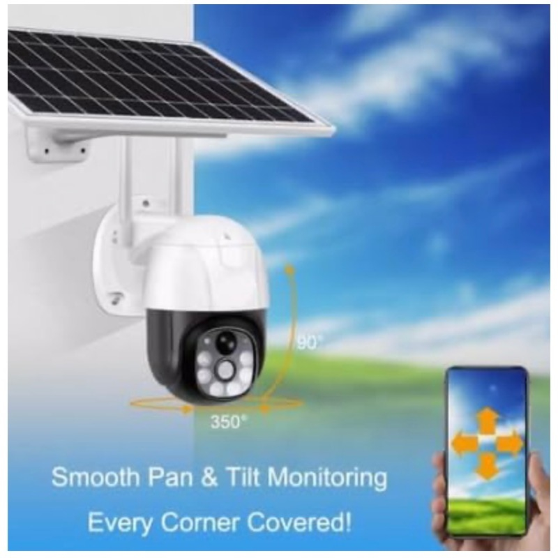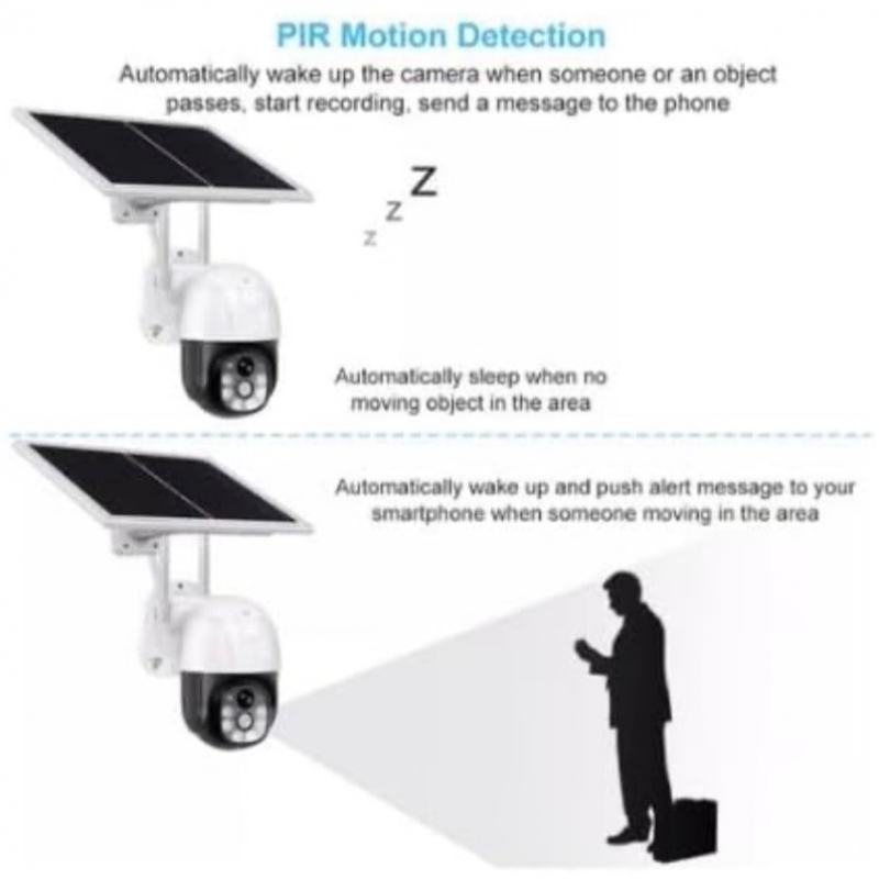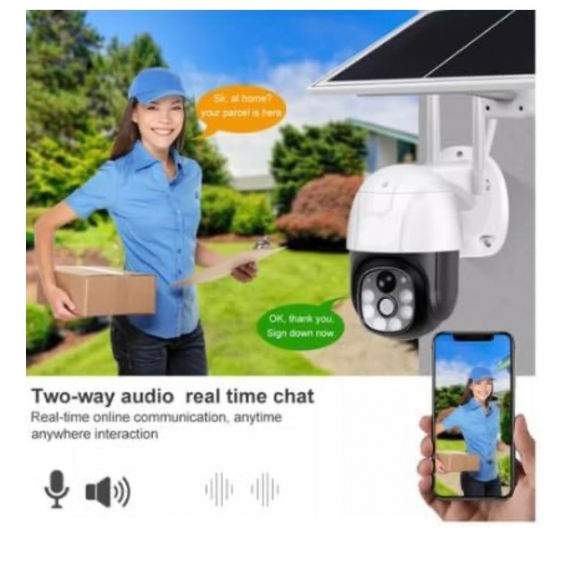 Full HD CMOS wide angle lens, 2MP 1080P wireless camera; -Support 2 Way audio/motion detection/picture push; -Intelligent day-night vision auto switch with IR-cut filter; -Support wireless 4G SIM Card -Support micro SD card max 128GB, support cloud storage; -Support P2P, remote control, and monitoring via the V380 pro App; -IP66 waterproof, Can used indoor and outdoor Features; -High definition -Solar charging built-in battery -Real-time motion detection alarm -Two-way audio real-time chat Specifications; -Video Compression Format: H.265 -Data Storage Options: Cloud, NVR, Memory Card -Resolution: 1920x1080P -Solar panel: 5W -Waterproof: IP66 Waterroof -Camera Type: HD 1080P Camera -Package weight; 1450g -Package dimensions; l=22cm x h=17.5cm x w=21cm What's in the box 1 x V380 Solar Powered 4G Outdoor Security With SIM Card Slot and Support