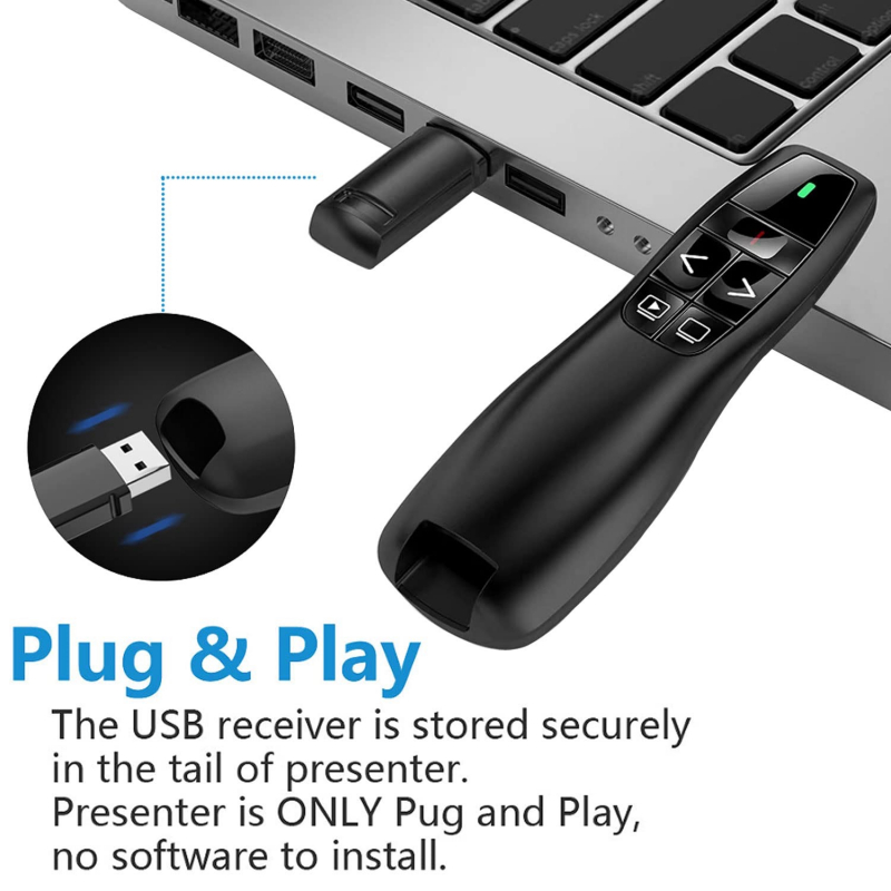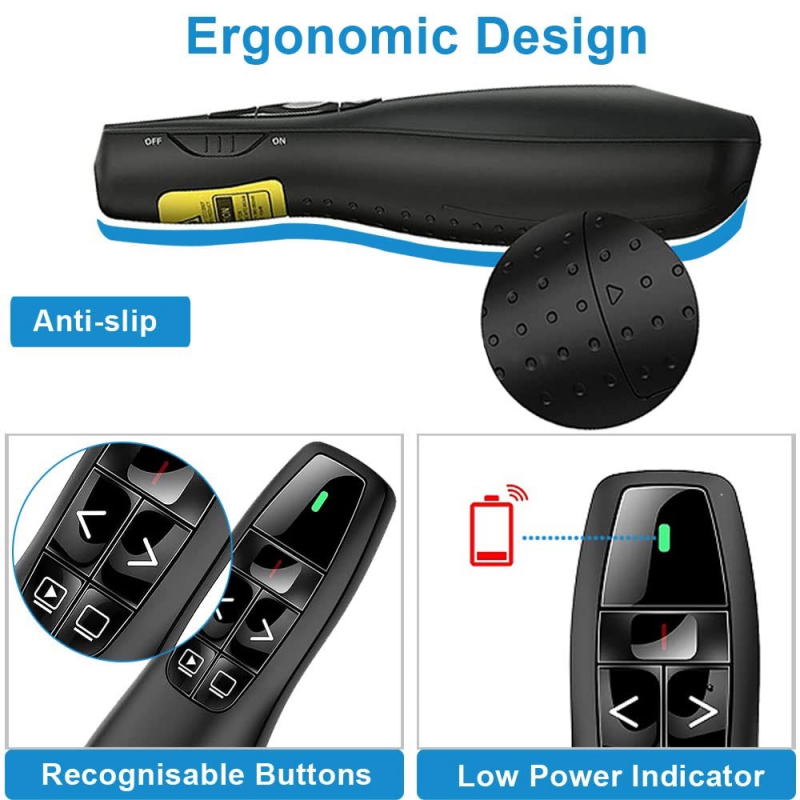 【Presenter Clicker Features】The compact size and ergonomic design allow you to hold presentation pointer presenter comfortably in your hand and easily fit into your pocket. Our power point clicker has 5 buttons, you can easily find the buttons. One-touch button design allows you to easily control the slideshow. The USB receiver stores inside of the computer clicker, so you don't worry about losing it.