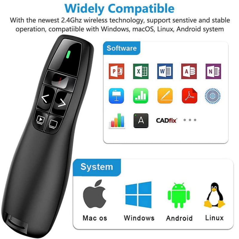 【Widely Compatible】The projector clicker for classroom supports systems: Windows 2003 / XP / Vista / 7 / 8 / 10, Mac OS, Linux, Android; laptop clicker for presentations supports software: PowerPoint, Google Slides, Keynote, Prezi, PDF, MS Word, ACD See etc.